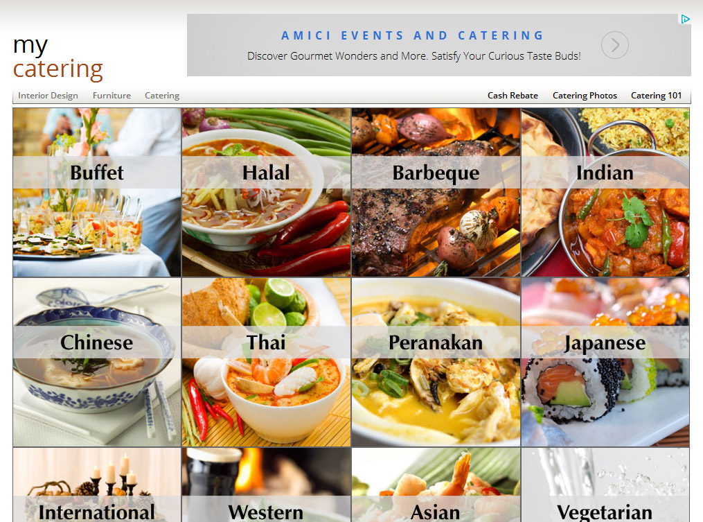 The web portal lists hundreds of caterers in Singapore. Each listing can come with a menu and slide show. The profile page displays contact details, including a map of the caterer location. This map is dynamically created by integrating Google Maps into the site.